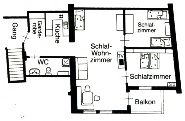 Mit seinen 85 m² ist unsere „Gala“ im zweiten Stock eine sehr großzügige Ferienwohnung und eignet sich für 4 bis 6 Personen. Sie unterteilt sich in eine separate komplett ausgestattete Küche, großem, schönem, hellem Wohnraum mit Sofa und gemütlichem Essbereich, 2 Schlafzimmern, Balkon und großem Bad mit Dusche und WC.